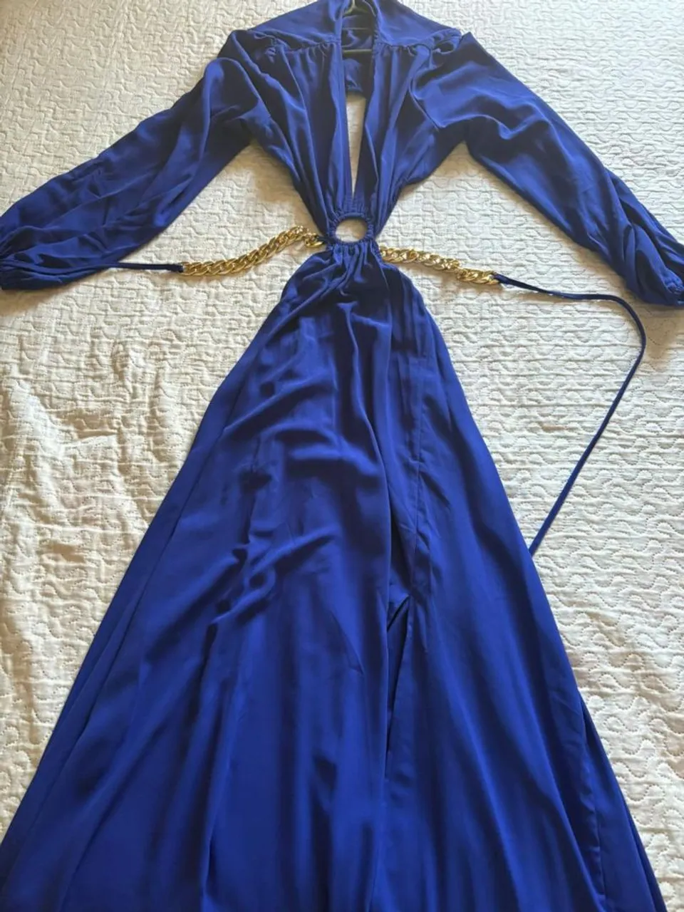 Vestido azul com costas nuas e amarração na lateral. Usado somente uma vez.