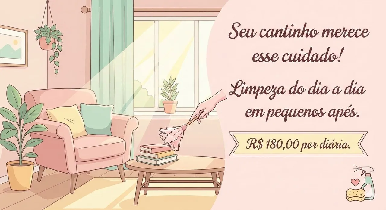 ?Cuidar de um apartamento pequeno exige atenção aos detalhes e muito carinho. Se você busca praticidade e um ambiente sempre cheiroso para relaxar, eu posso te ajudar!