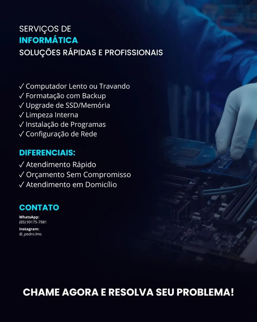 ? PC lento ou travando? Sou Pedro, técnico de informática. Formatação, upgrade e limpeza. ? Atendo em domicílio ? Chama no WhatsApp