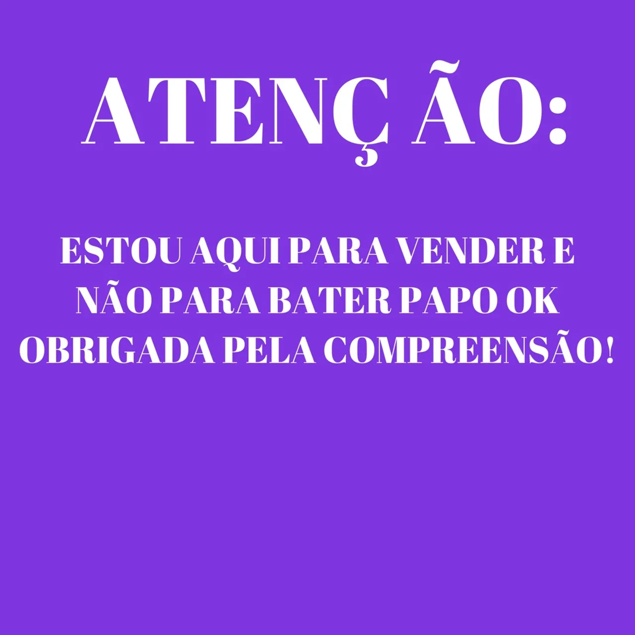 Olá! Agradeço o contato e a compreensão, mas neste momento estou focada exclusivamente em assuntos relacionados às minhas vendas. Caso não tenha interesse em adquirir os produtos e queira somente bater papo,existe outros sites com essa finalidade.Obrigada