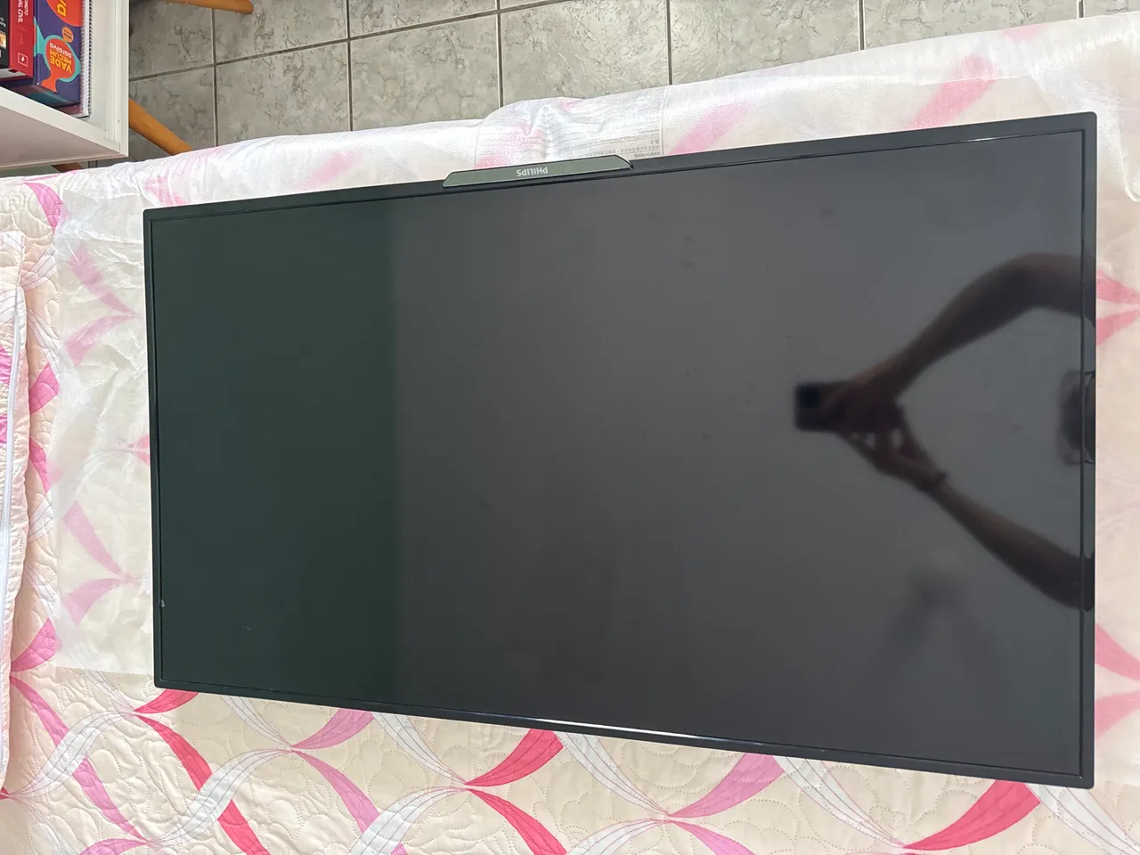 A tela não está quebrada nem trincada, porém o LED apresenta defeito em um dos lados, causando falha na imagem nessa parte. O som está funcionando normalmente e ainda é possível assistir, apesar do defeito visual parcial. Acompanha cabo, caixa e controle remoto.