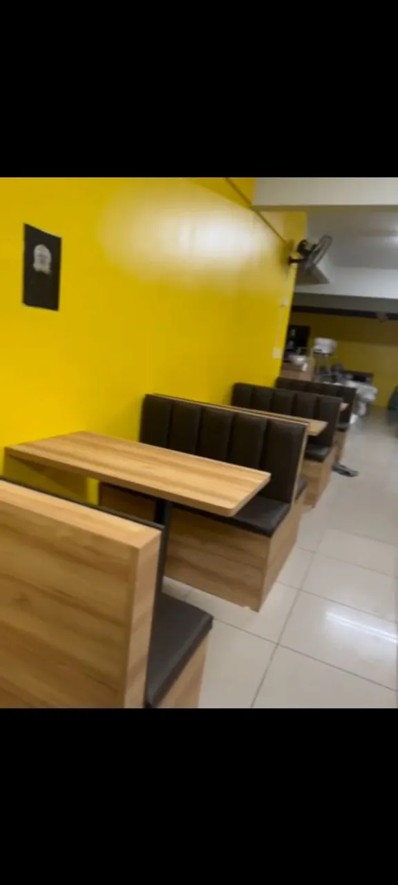 Conjunto de mesas e sofás acolchoados para um ambiente moderno e aconchegante. Perfeito para otimizar o espaço e oferecer conforto aos seus convidados.